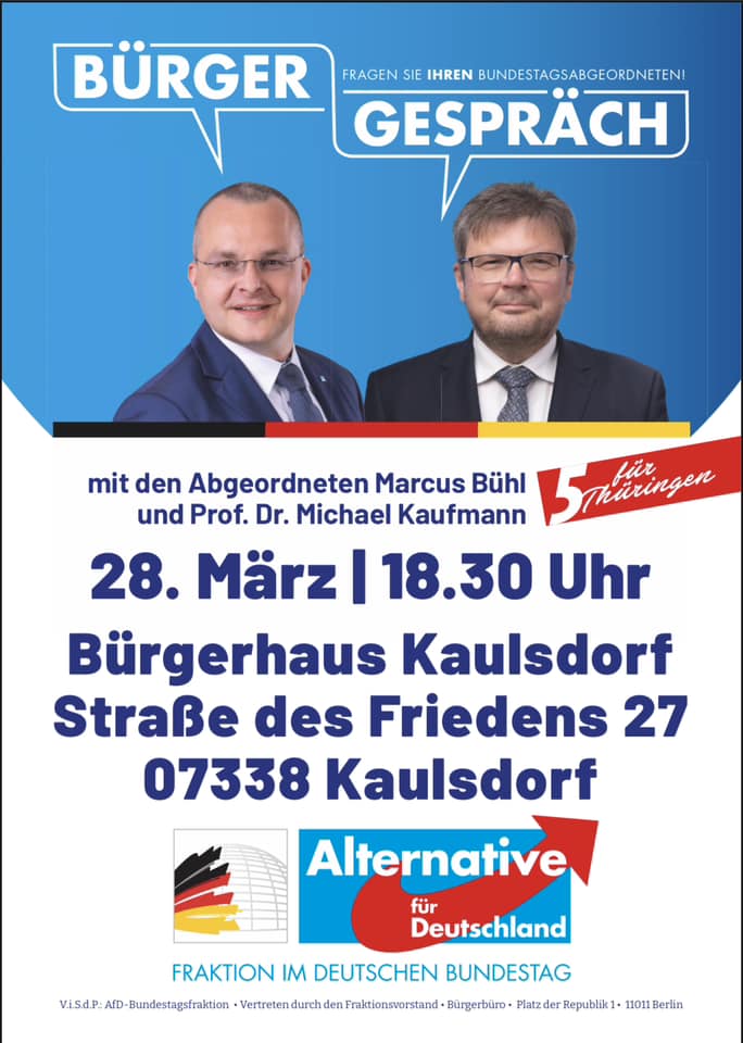 auf reges Interesse stieß die Veranstaltung am 28.03.24 im Bürgerhaus in Kaulsdorf. Trotz des darauffolgenden Feiertages und der angekündigten Gegendemo vom linken Spektrum fanden sich über hundert interessierte Bürger gegen 18:30 Uhr im Saal des Bürgerhauses ein. Verena Sigmund leitete kurz in die Veranstaltung ein und dann ging es auch schon los. Michael und Marcus berichteten über ihre Arbeit im Bundestag und beantworteten die Fragen aus dem Publikum. Ich nutzte die Einladung und konnte mich den Bürgern kurz vorstellen.